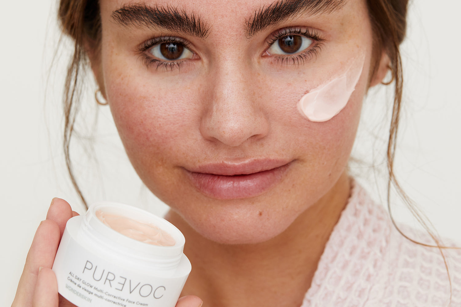 After washing your face with a cleanser, apply a serum followed by the PUREVOC Face Cream, and your sunscreen should go on after.